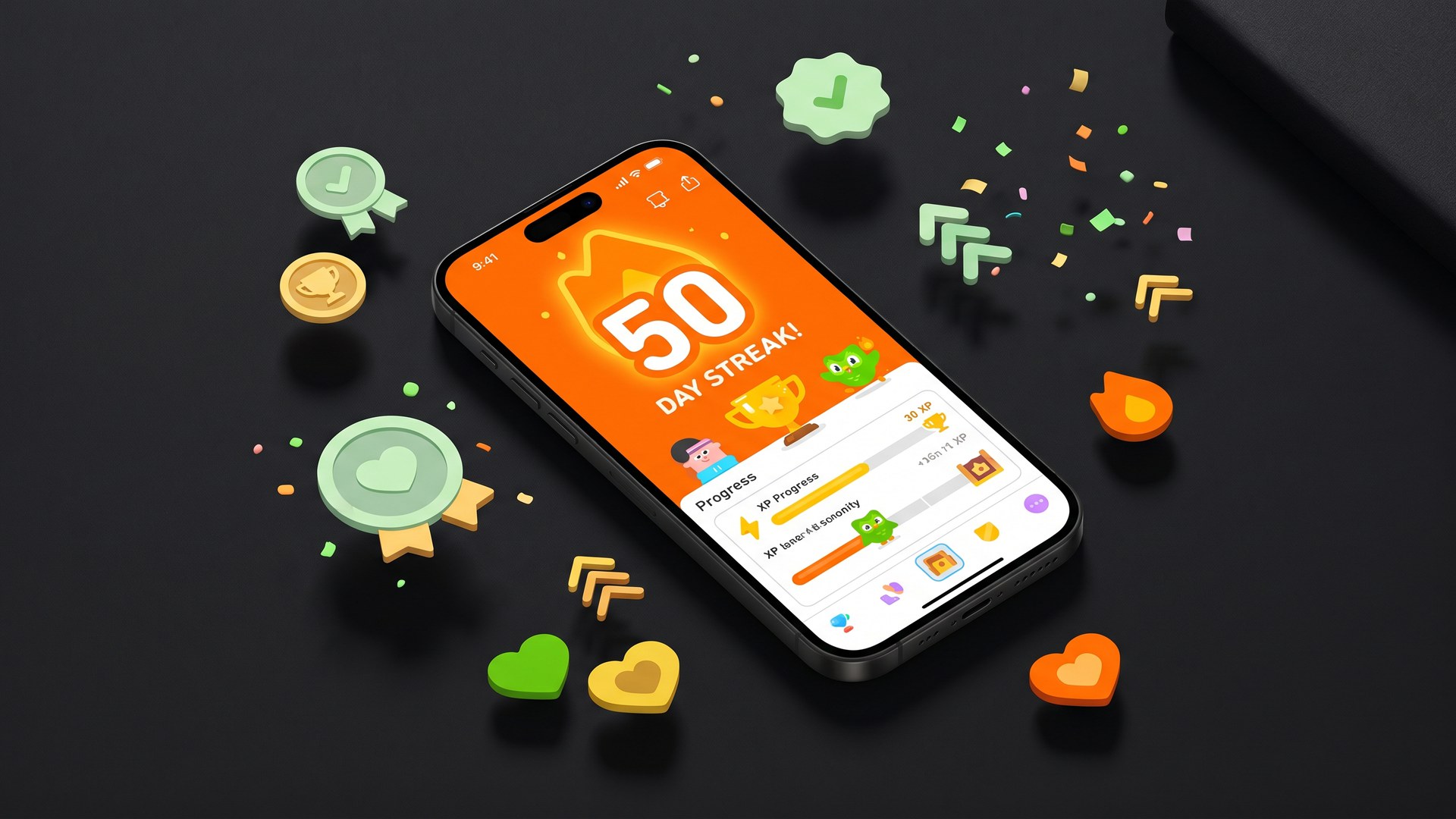 Translation: streaks plus XP plus achievements plus levels, working together, measurably change behavior. One mechanic alone isn't enough.